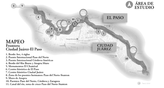 La frontera Ciudad Juárez-El Paso es un espacio enriquecido por la presencia de un número importante de manifestaciones, efímeras y objetuales, que crean focos de atención en ciertos lugares, los cuales a su vez crean radios de influencia en determinadas zonas de ambas ciudades. Los principales lugares en los que se presentan radios de influencia son aquellos donde se localizan los cruces internacionales, influencia que continúa esporádicamente a lo largo de la línea fronteriza. Los puentes internacionales considerados más públicos, o bien los que tienen más afluencia peatonal, son los que presentan mayor número de manifestaciones. Los puentes internacionales son: Puente Internacional Paso del Norte,3 puente Stanton, puente Córdova Américas y puente Zaragoza. Los dos cruces con mayor afluencia peatonal son el puente Córdova Américas y la zona de dos puentes hermanos –Puente Internacional Paso del Norte y puente Stanton–, debido al intercambio comercial que se da en ellos y a cuestiones históricas de ambos sitios. En la zona de los puentes se observa un amplio radio de influencia debido a que comparten avenidas principales, como conexiones intraurbanas, yuxtaponiéndose los caminos recorridos.