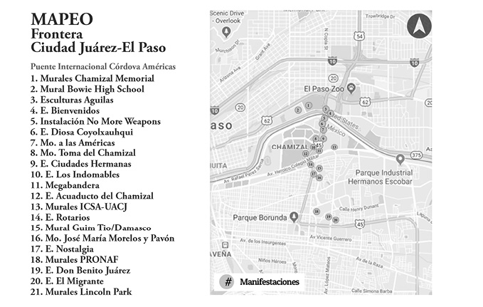 fotografías de brenda ceniceros (2017)A lo largo del bordo, por el lado mexicano de la frontera Ciudad Juárez-El Paso, también se desarrollan manifestaciones, mayormente en monumentos históricos y esculturas. Existen zonas donde la frontera llega a desdibujarse, esto debido a los elementos naturales del sitio, como los cerros. En esas zonas, donde la región se vuelve una, aparecen manifestaciones efímeras, anónimas, como actos de registro de un momento, y que algunas veces, gracias a la difusión mediática, pueden ser percibidas e internalizadas por las personas.