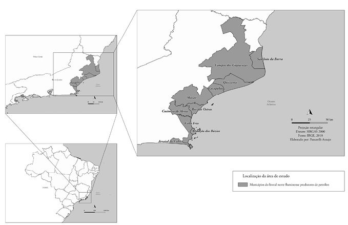 Os municípios da Bacia de Campos localizados na Baixada Litorânea –Arraial do Cabo, Armação dos Búzios, Cabo Frio, Casimiro de Abreu e Rio das Ostras– e no Norte Fluminense –Carapebus, Campos dos Goytacazes, Macaé, Quissamã e São João da Barra– podem ser visualizados na Figura 1. Observe que se trata de municípios litorâneos, tendo em vista que a produção de petróleo e gás, nesta região, dá-se em alto mar (off shore). Até recentemente, mais de 80% da produção petrolífera brasileira era extraída desta Bacia, gerando compensações financeiras –royalties e participações especiais– de grande volume para esses municípios.