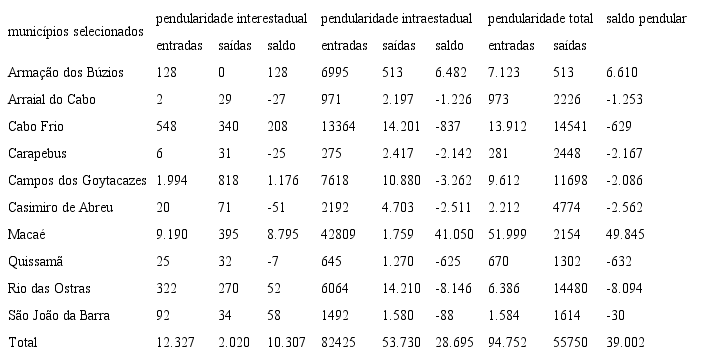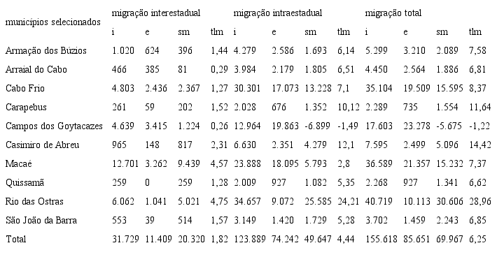 Na Tabela 1 apresentam-se informações referentes às migrações interestaduais e intraestaduais, para os municípios selecionados –Arraial do Cabo, Armação dos Búzios, Cabo Frio, Carapebus, Campos dos Goytacazes, Casimiro de Abreu, Macaé, Quissamã, Rio das Ostras e São João da Barra– referentes ao período 2005-20102.