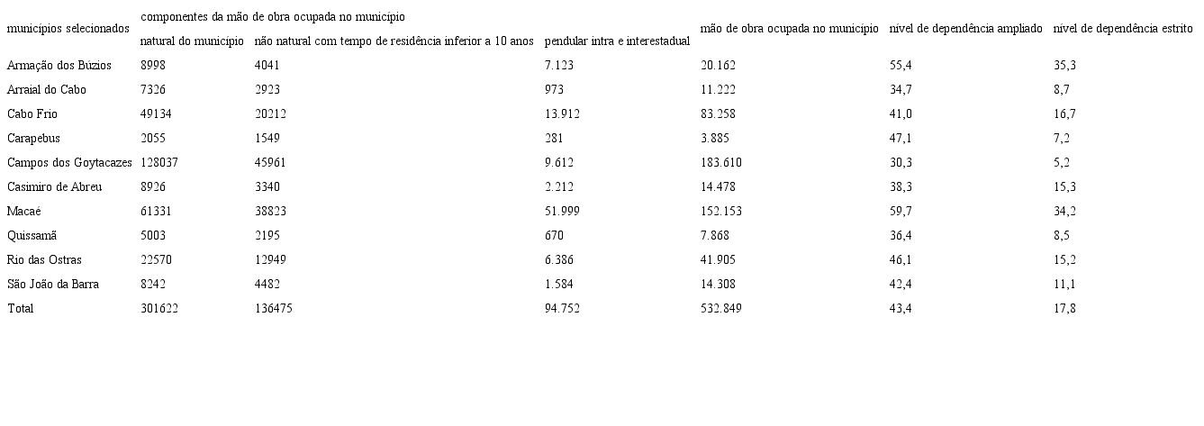 Considerando-se apenas a mão de obra pendular, no numerador, para a estimativa do indicador estrito, percebe-se uma dependência de mão de obra exógena (estrita) de 35,34% em Armação dos Búzios e de 34,18% em Macaé (Tabela 4). Observe que a diferença entre o indicador ampliado e estrito se deve aos movimentos migratórios, de onde se conclui que para Búzios e Macaé os dois componentes deste indicador –migração e pendularidade– são praticamente igualmente importantes para suprir a necessidade de mão de obra –mais qualificada– desses mercados de trabalho; e que apesar da pendularidade, antes bastante restrita ao ambiente metropolitano, estar aumentando em áreas interioranas, as migrações interestaduais e intraestaduais ainda são fundamentais para a continuidade do processo de reprodução do capital, ainda que não resultem em ascensão social dos trabalhadores migrantes, mas simplesmente os mantenha na estrutura social relativa.