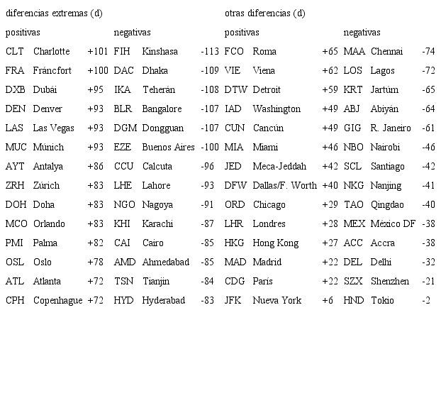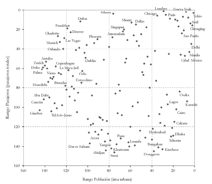 Las diferencias en el puesto ocupado por las ciudades en cada caso pueden llegar a ser superiores a 100 posiciones, bien negativas como en Kinshasa (-113), Dhaka (-109), Teherán (-108) y Bangalore (-107); o bien positivas, como Charlotte (+101) o Fráncfort (+100), donde se acentúa la falta de correlación poblaciónpasajeros. Por norma general, las diferencias negativas predominan en los países en vías de desarrollo, pues en ellos se registran las mayores tasas de crecimiento urbano, mientras que se trata de ciudades con escasa entidad económica y con un débil sector servicios. Consecuentemente, la mayor parte de estas ciudades no genera una demanda que impulse el desarrollo del tráfico aéreo y el consiguiente crecimiento de la actividad aeroportuaria.