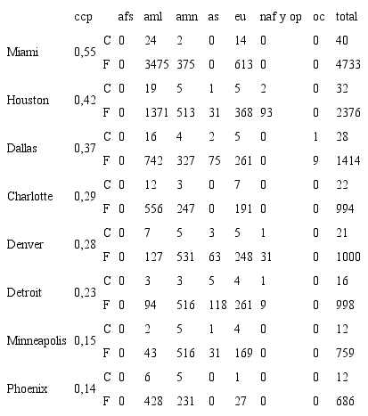 Asimismo, es conocido cómo otras ciudades de Estados Unidos desempeñan funciones de hub; por ejemplo, Miami, Houston, Dallas, Charlotte, Denver, Detroit, Minneapolis o Phoenix, entre otras (Derudder, Devriendt, & Witlox, 2007). Ellas centralizan buena parte del tráfico aéreo del país y constituyen, además, la sede de alguna de las principales aerolíneas americanas; sin embargo, sus flujos tienen un carácter eminentemente doméstico. Solo en algunos casos, como los de Miami, Houston y Dallas, destaca su intensa conexión con Latinoamérica (tabla 7).