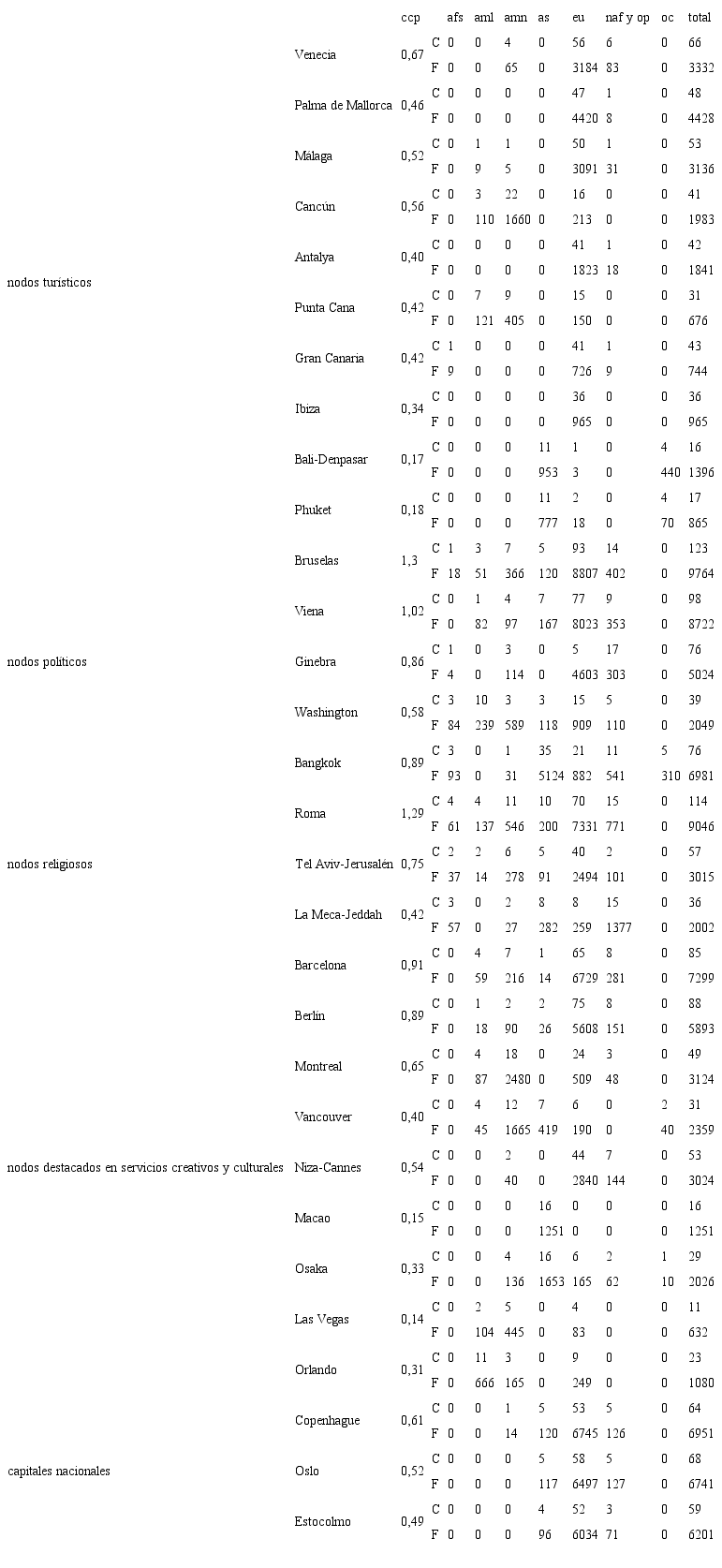 Los resultados, asimismo, muestran las tesis señaladas por algunos autores, donde la globalización no es un estado, sino un proceso; es decir, “una dinámica que ha afectado a todas las ciudades del mundo, si bien de diferente forma e intensidad, y no solo a algunas ciudades en la cumbre de la jerarquía” (Marcuse & Kempen, 2000, p. xvii). De esta manera, además de las grandes ciudades globales que aparecen mencionadas en la mayoría de los rankings sobre jerarquías urbanas, se han identificado otros centros emergentes cuya especialización funcional los dota de una notoriedad significativa y nada desechable desde un punto de vista geográfico, si se quiere tener un panorama amplio, completo e inclusivo de las dinámicas urbanas contemporáneas. Estos centros, aunque de menor proyección internacional, son de gran interés en la organización y estructura territorial, poniendo en evidencia cómo una parte considerable del tráfico aéreo mundial está motivado por múltiples factores de distinto, sea político (Bruselas, Washington, Viena), religioso (Roma, Jerusalén, La Meca), migratorio (ciudades mexicanas). A ello se debe añadir el papel que tiene en la actualidad el turismo como factor de organización regional (ciudades de la cuenca mediterránea, Caribe y enclaves turísticos del sureste asiático, entre otros), y la movilidad que generan los servicios culturales y creativos, tanto de los profesionales del sector como de turistas o visitantes, que acuden para consumir el “estilo” de ciudad generada por estas actividades. Por ejemplo, en ciudades como Barcelona, Berlín, Montreal, Niza-Cannes o Las Vegas, este tipo de actividades adquieren gran representatividad.