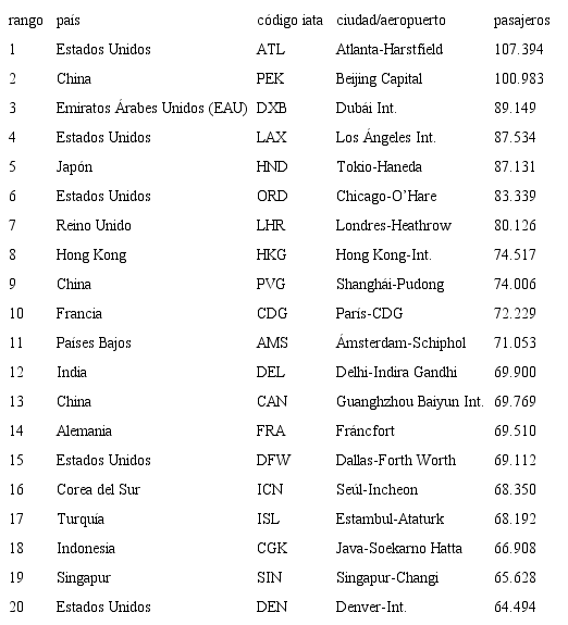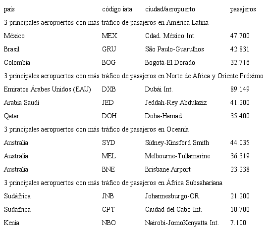 Una primera aproximación al tráfico aéreo mundial de pasajeros habla del gran volumen de personas movilizadas a través de este medio de transporte. En 2018, la cifra alcanzó los 4,3 millones de pasajeros (iata, 2019), el equivalente al 45,6% del volumen demográfico mundial. La gran mayoría del tráfico aéreo global (83,6%) se produce en tres regiones: Asia (34,5%), Europa (26,7%) y América del Norte (22,4%), que coinciden con el eje oeste-este del hemisferio norte. Además, las rutas intercontinentales más importantes unen algunas de las regiones económicas más activas del mundo, incluyendo Europa-Norteamérica (3%) y Europa-Asia (2%). Precisamente, es en estas regiones donde sitúan los aeropuertos más transitados del mundo (tabla 1) y donde aparecen la “mayoría de las 300 ‘súper-rutas’ con más de un millón de pasajeros anuales, que concentran más del 20% del tráfico aéreo mundial” (Amadeus, 2013).