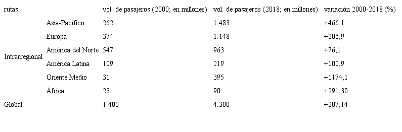 El resto de continentes tiene una presencia más modesta, actuando en gran medida de alimentadores (feeders), como América Latina, Oriente Medio, África y Oceanía. En estas regiones se encuentran pocos aeropuertos entre los cincuenta más transitados del planeta, a pesar de que en ellas se localizan algunas de las principales megalópolis (tabla 2-abcd). Sin embargo, han protagonizado el incremento del tráfico de pasajeros más acusado durante los últimos años, contribuyendo al crecimiento positivo global en un 207,14% entre 2000 y 2018, a pesar de acontecimientos que hayan podido mermar, de manera puntual, la evolución de los últimos años (tabla 3). Los mercados emergentes fueron los principales impulsores de este crecimiento; regiones como Oriente Medio (+1174,1%), Asia (+466,1%), Latinoamérica (+100,9) y África (+291,3%) han experimentado tasas de crecimiento muy significativas, poniendo de relieve cómo las rutas Sur-Norte/Sur-Sur tienen una creciente notoriedad en el sistema aéreo global.