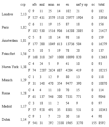 Respecto al resto de regiones (tabla 6), se observa que las ciudades de Asia, Oriente Próximo y América del Norte, aunque no llegan a los ccp europeos, también polarizan flujos significativos provenientes de áreas de influencia amplias, especialmente Bangkok (hub de Asia; cpp=0,87), Doha (segundo hub de Oriente Próximo, después de Dubái; cpp=0,82) y Toronto (segundo hub de América del Norte, después de Nueva York; cpp=0,97).