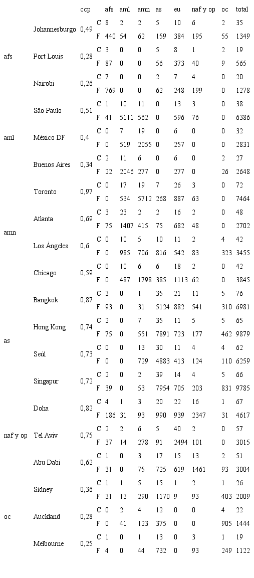 Selección de parámetros estadísticos. Posteriormente, se ha dotado a las ciudades de la información requerida (frecuencias y conexiones aéreas internacionales). La fuente utilizada es la guía abc en formato digital “Base de datos de Comber International Guides – Official Airline Guide (oag), para noviembre de 2015”, cuyos datos se refieren a los vuelos regulares, incluida la totalidad de las relaciones en el ámbito internacional. Estos datos se procesaron en matrices origen/destino según la dirección de los vuelos, clasificados estos por grandes regiones mundiales.3