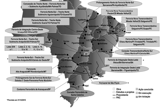 No segundo governo Lula foi criada a empresa pública Valec Engenharia, Construções e Ferrovias s.a. (valec) (Lei 11.772, de 2008), com a função de realizar a construção e exploração de infraestrutura ferroviária. A empresa se tornaria responsável pelas Ferrovia Norte-Sul (ef-151), Ferrovia do Pantanal (ef-267), Ferrovia da Integração Oeste-Leste (ef-334) e a Transcontinental ou Ferrovia de Integração Centro-Oeste (ef-354). Quanto à Ferrovia Transnordestina (ef 232), caberia à empresa estatal participar minoritariamente do capital de empresas que tivessem o objetivo de construí-la.