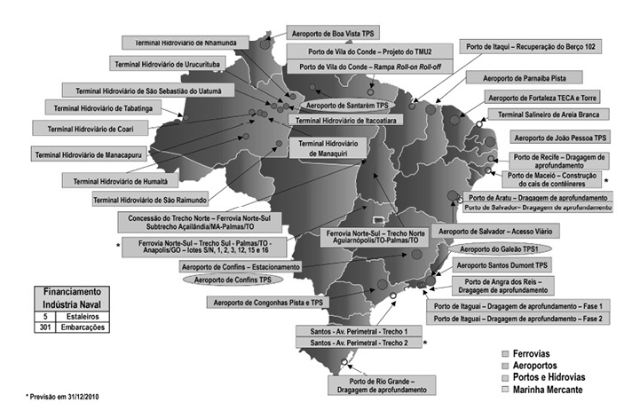 Com relação aos terminais hidroviários implementados pelo pac, destacam-se 10 terminais no Estado do Amazonas, no balanço do pac 2007-2010: Tabatinga, Coari, Itacoatiara, São Raimundo, Manacapuru, Humaitá, Manaquiri, Urucurituba, Nhamundá e São Sebastião do Uatumã. Quanto aos Portos, tratam-se de obras de dragagem, ampliação e acesso rodoferroviário nos portos de Rio Grande (rs), São Francisco do Sul (sc) e Paranaguá (pr), na região Sul; Rio de Janeiro (rj) Itaguaí (rj), Angra dos Reis (rj), Vitória (es) e Santos (sp), no sudeste; Aratu (ba), Salvador (ba), Suape (pe), Recife (pe), Cabedelo (pe), Areia Branca (rn), Natal (rn), Fortaleza (ce), Luís Correia (pi) e Maceió (al), na região Nordeste; e Vila do Conde (pa), na região Norte.