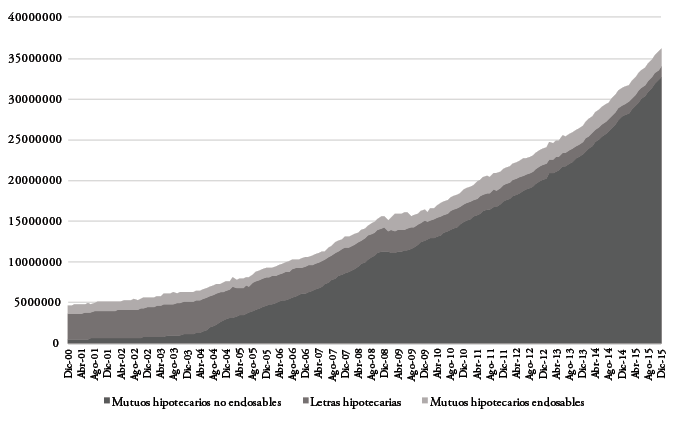 Lo anterior implica una atenuación de los ritmos del endeudamiento (aunque persisten igualmente altos niveles absolutos de endeudamiento) en el centro del país y una aceleración en casi todas las demás regiones. El mefpe asociado a este proceso fue sin duda el mutuo no endosable más difundido social y espacialmente, y ello gracias dos circunstancias: es más barato que los transados en mercados de capitales, y ha sido otorgado por la banca, la cual, pese a su centralización en pocas pero poderosas instituciones, presenta un gran alcance territorial. Lo que también revela el peso creciente de los créditos hipotecarios en el total de las colocaciones es que ha disminuido el flujo de recursos hacia las deudas asociadas a la producción. Lo anterior atañe incluso a los créditos a la construcción, lo que deja abierta la pregunta respecto de si la desintermediación bancaria y la búsqueda de capitales en los mercados financieros serán estrategias suficientes y viables para mantener las condiciones de reproducción del capital en la esfera productiva.
