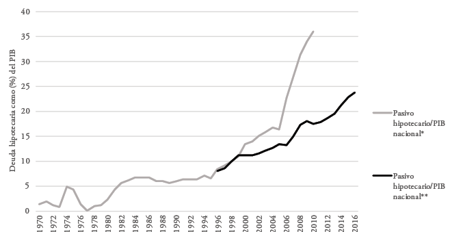 Si se observa el periodo comprendido entre 1970 y 2016 a partir de dos estimaciones distintas del peso del endeudamiento hipotecario en relación al pib, y a pesar de divergencias de consideración entre las series comparadas (figura 2), es posible sostener que, desde 1981, el crecimiento del endeudamiento no ha descendido de 5% respecto al pib y que esta relación se ha disparado desde finales de los noventa. Esta financiarización ha derivado más de la masificación del crédito barato de los mutuos hipotecarios no endosables (en relación a los otros mefpe) que de los endosables, cuya emisión y securitización presentan una baja representación en relación con los anteriores y con las letras. De esa manera, Chile –a pesar de estar lejos de los niveles de deuda hipotecaria en relación al pib nacional de países como Dinamarca (114% en 2013), Holanda (101,2% en 2012) o España (62,9% en su punto más alto en 2009) (cesifo dice, 2015)– presenta uno de los más altos en América Latina, junto a Panamá, llegando a 24%, diferenciándose poco del que existía antes de las crisis en países como Grecia (29,8%).