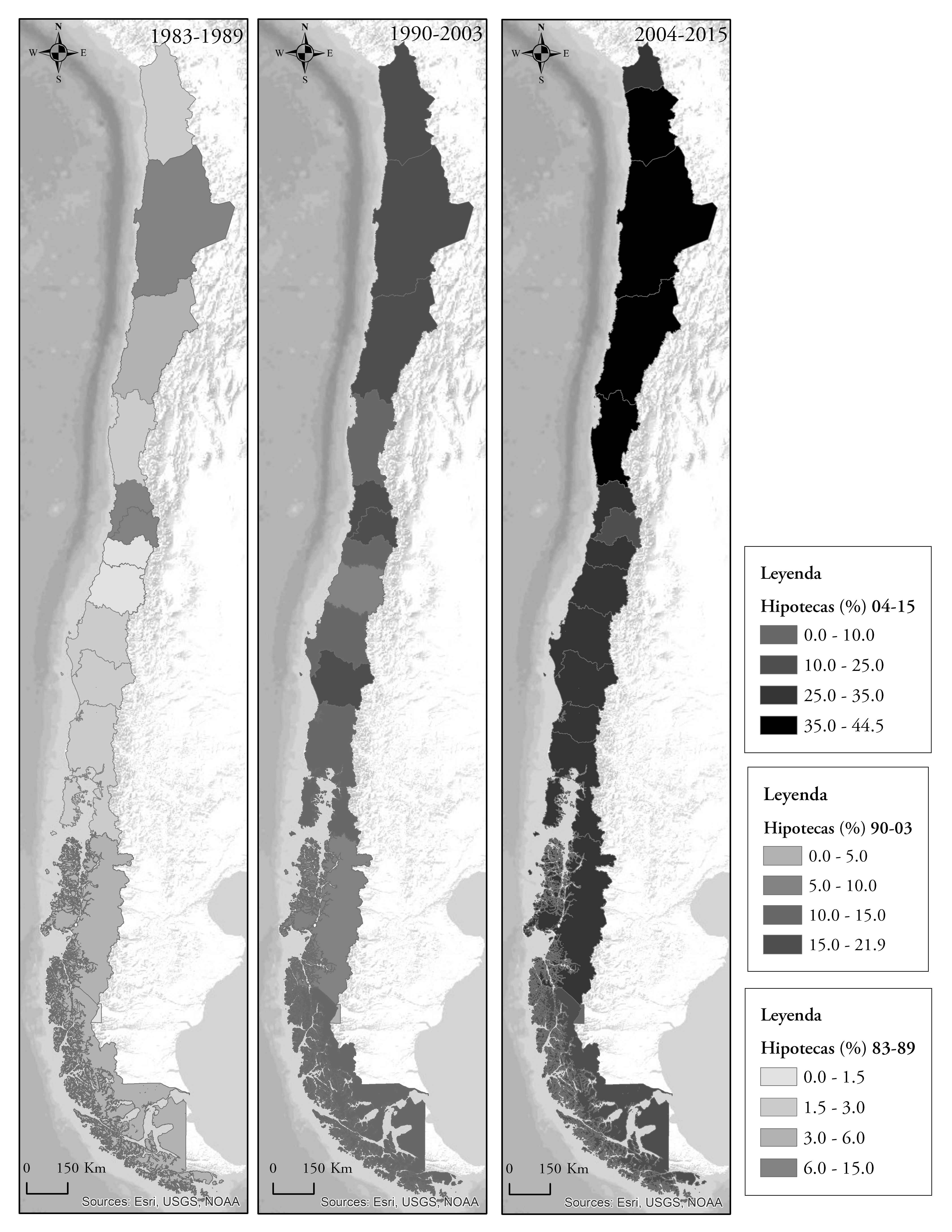 Entre 1990 y 2003, la producción masiva de viviendas sociales impulsada por los gobiernos democratacristianos, combinada con la masificación de los mefpe (ya articulados a un creciente y poderoso mercado de capitales), implicó un aumento del promedio regional a 14%. Hubo una redistribución espacial del peso de las colocaciones hipotecarias, pasando a ser Antofagasta la región en la que esa relación fue mayor (21%), seguida de la Metropolitana (17%); en las regiones del norte el aumento fue muy significativo y en el sur alcanzó a Biobío y La Araucanía en niveles de entre 14% y 16%. Esa distribución regional señala que las geografías de la deuda hipotecaria alcanzaron mayores niveles tanto en las regiones con las metrópolis más importantes del país, como en las regiones económicamente dinámicas con mercados de vivienda que incluyen segmentos especulativos –para inversión, alquiler o segunda residencia–, como las del norte del país, por ejemplo.