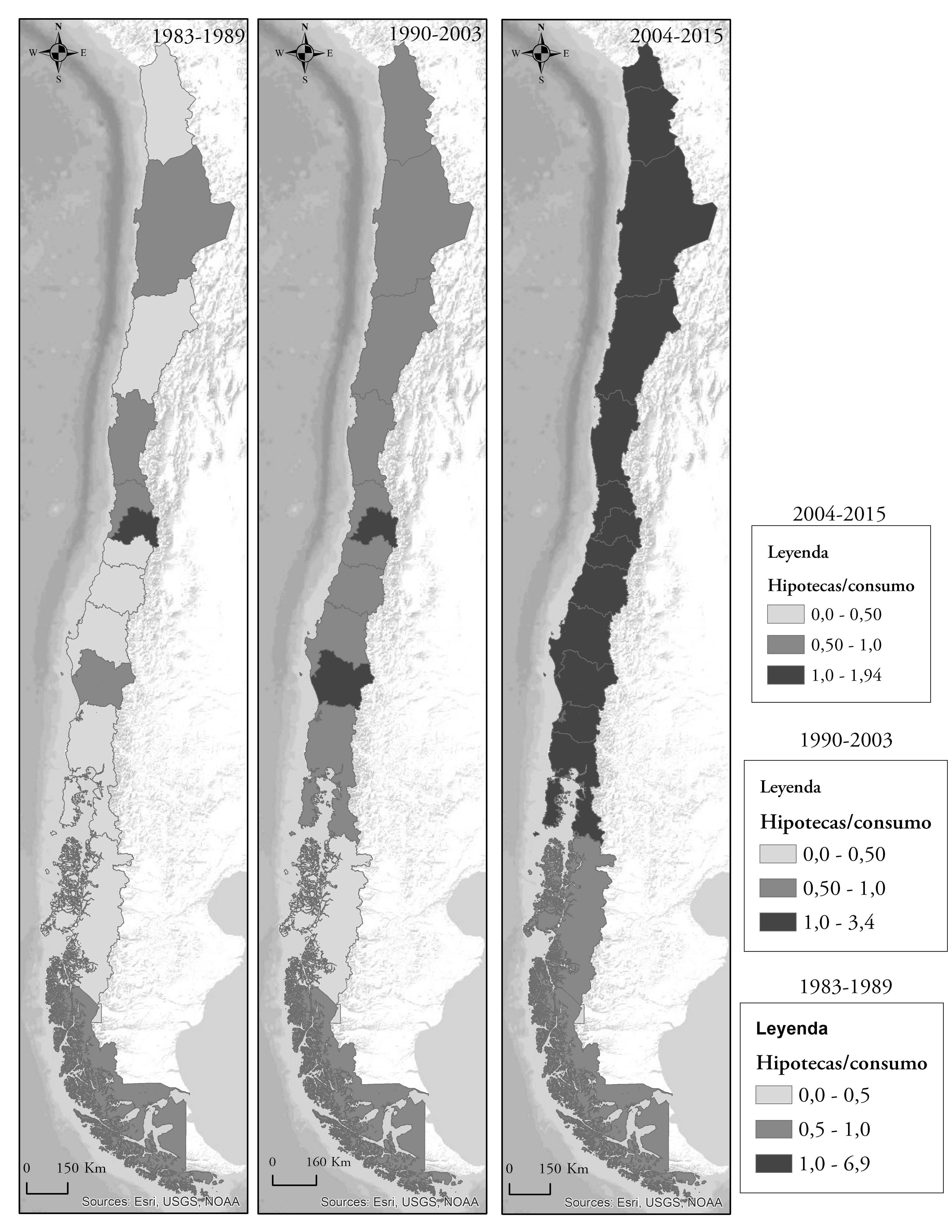 elaboración propia a partir de díaz et al. (2016) y sbif (2017)Aunque se intentó construir los mapas con intervalos constantes para facilitar la comparación, ello fue imposible dado el fuerte aumento del peso de las colocaciones hipotecarias por sobre las totales, con cambios extremadamente abruptos. De esa manera, entre 1983 y 1989, en las regiones de Antofagasta, Valparaíso y Metropolitana esta última relación –peso de las colocaciones hipotecarias por sobre las totales– fue más alta que en las demás, con 6,1%, 7% y 13,5%, respectivamente, frente a un promedio de 3,9% para todas las regiones (figura 3). Lo que demuestran esas cifras es que a pesar de que en ese momento la letra hipotecaria era el mefpe más importante para acceder a una vivienda, el endeudamiento era bajo, producto de un lento ritmo de la construcción habitacional posterior a la crisis de 1982 (Hidalgo, 2005), aunque tendía a ser mayor en las regiones más urbanizadas: la Metropolitana y la de Valparaíso y en menor medida en Antofagasta, una de las ‘regiones ganadoras’ en ese momento, cuando la economía giraba en torno a la minería del cobre.