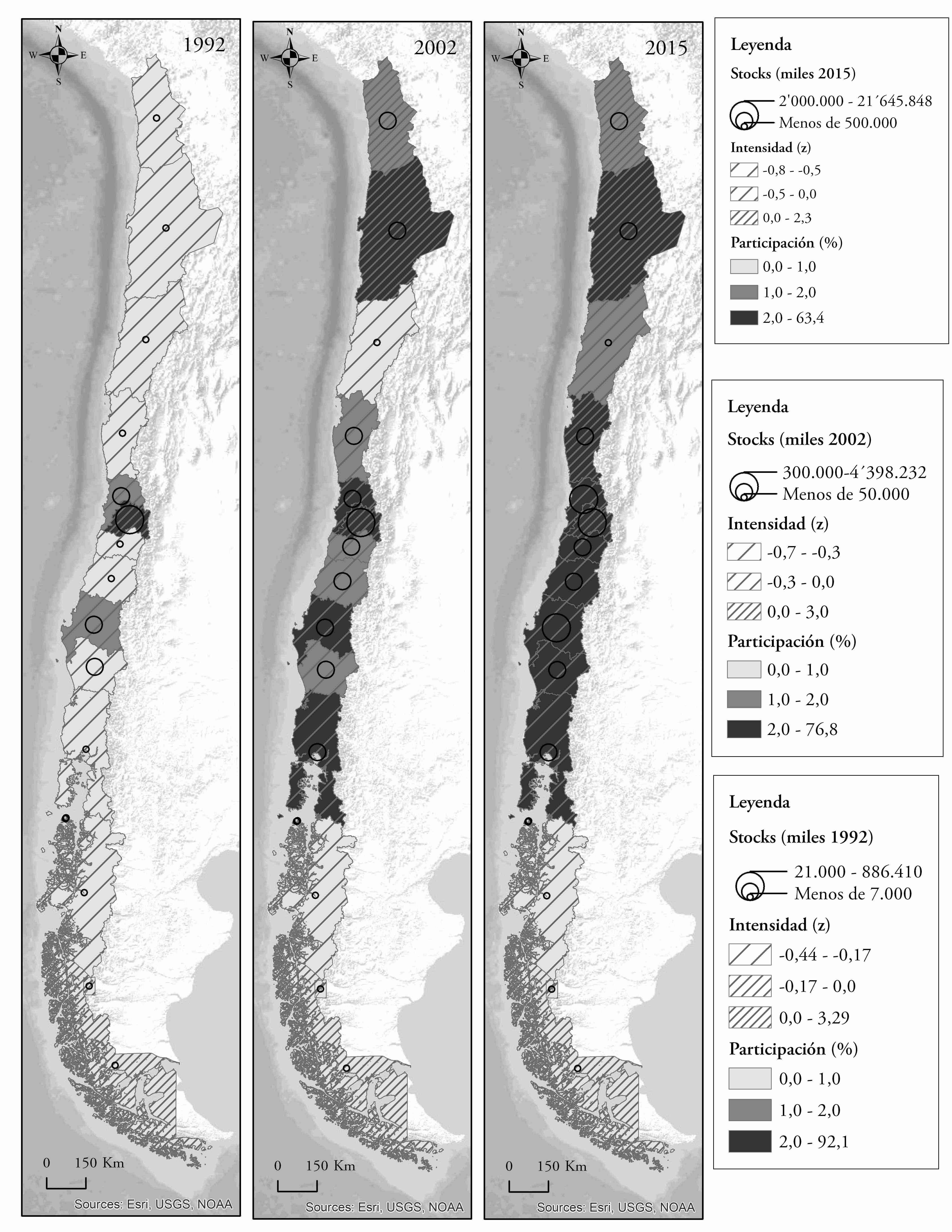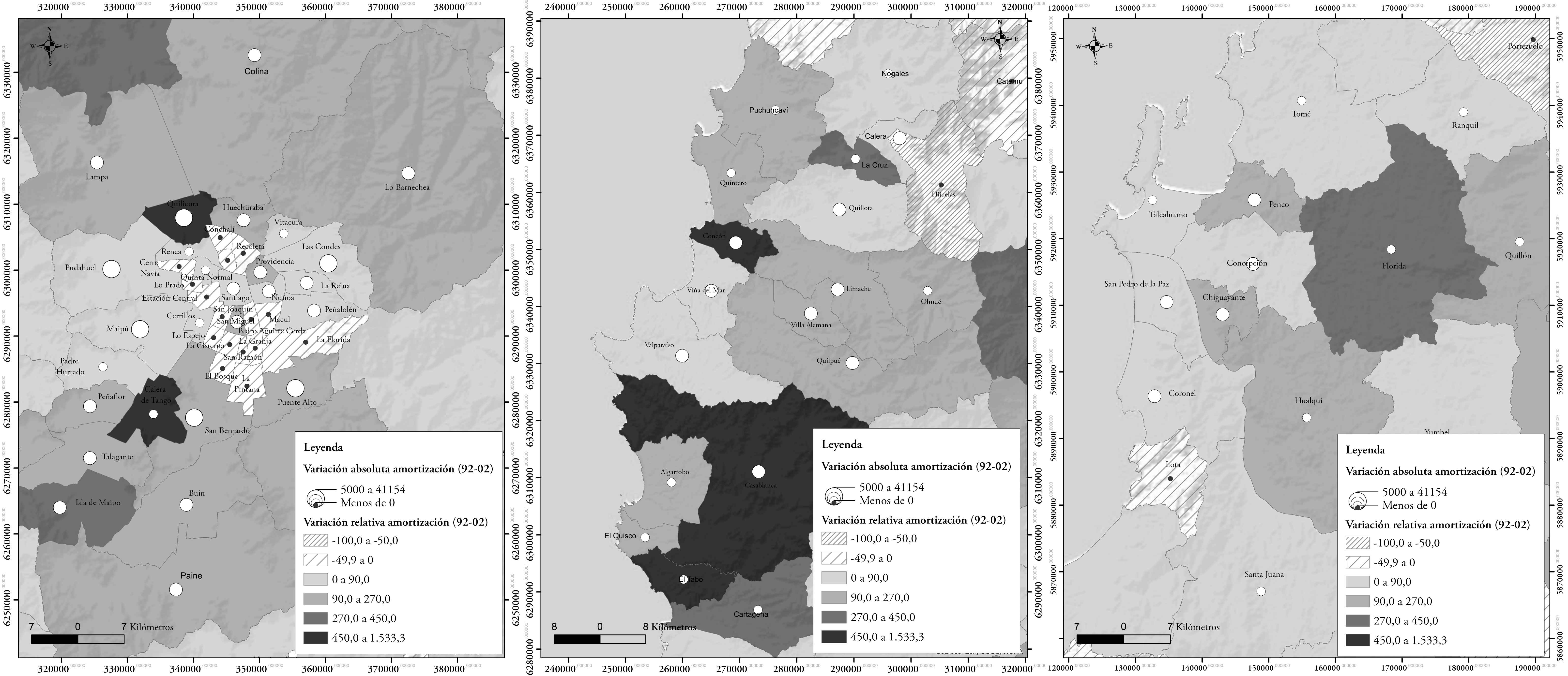 La financiarización del consumo de vivienda ha facilitado así en todo el país, a nivel regional, una expansión del endeudamiento hipotecario, además de una intensificación de ese ritmo por encima del promedio en las regiones más urbanizadas o con mercados habitacionales dinámicos. Y al hacer un acercamiento a la escala de las principales regiones metropolitanas –Santiago, Concepción y Valparaíso– en el único periodo para el cual se cuenta con datos censales contrastables (1992 y 2002), se confirma que esa lógica regional se replica en las mismas.