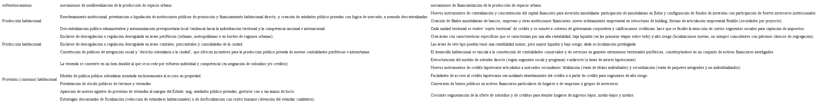 La distinción entre los mecanismos señalados suele pasarse por alto en la literatura sobre la financiarización de la vivienda, por lo cual se pierde gran parte de la capacidad analítica del concepto. A pesar de la especificidad nacional que ellos puedan asumir, se plantea una clasificación que, sin ánimo de ser exhaustiva y exclusiva, provee un punto de partida útil para el rastreo de los procesos de neoliberalización y financiarización de la producción del espacio urbano y la vivienda a partir de elementos comunes, identificables en casos como el de Estados Unidos, Reino Unido, España y otros latinoamericanos, como Chile y Colombia (tabla 1).