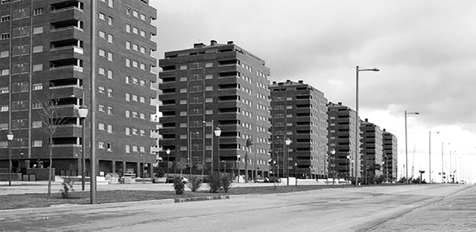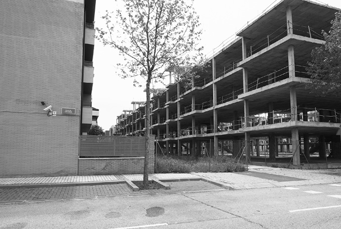 1. El primero que destaca, por su importancia internacional, medida según la atención mediática suscitada, es la Urbanización El Quiñón, en el núcleo de Seseña Nuevo (4915 hab. en 2017), en las proximidades de la ciudad de Seseña (22.992 hab. en 2017), asentamiento tradicional compacto. Es fruto de la clasificación de terrenos rústicos en urbanizables y urbanos donde los nuevos desarrollos se han generado fuera de los tradicionales límites urbanos (Pozo & Cebrián, 2016, p. 251 y ss.). El Quiñón (1.822.147 m2) se diseñó, en 2004, para más de 15 mil viviendas (multifamiliares y en bloques de 9 y 10 plantas), construidas cuando la ciudad principal, Seseña, solo albergaba 7621 habitantes y se localiza en el eje de comunicación viaria de la A-4 (autovía que conecta la capital con Andalucía) a unos 30 km de Madrid. Se trata de un excelente ejemplo de ciudad inconclusa, ciudad fantasma o de “persianas bajadas” (Pozo & Cebrián, 2016, p. 273), como podemos observar en la figura 2. En un contexto político muy complejo, con cambios continuos en el poder municipal, es consecuencia de sucesivos Planes de Actuación Urbanística (pau) municipales (el primero de ellos de 2003, cuando el Ayuntamiento adjudicó el pau de El Quiñón a la empresa Obras Nuevas de Edificación (onde) 2000 s.l., con uso residencial a partir de viviendas multifamiliares y edificios en open planning de 9 y 10 plantas). Ocurrieron, además, numerosas irregularidades, algunas conocidas por la prensa nacional, debido a la progresiva recalificación de suelo y las prácticas de edificación anteriores a la propia urbanización, paralizadas periódicamente por ausencia de servicios (suministro de agua) y donde el propio promotor, Francisco Hernando “El Pocero”, debió pagar una deuda adquirida con la Administración Pública.