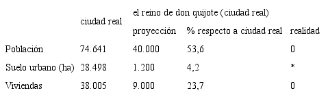 3. El proyecto Gran Resort El Reino de Don Quijote se localiza a 5 km de Ciudad Real, capital con 74.743 habitantes en 2018 (ine, 2019). Está vinculado a dos grandes infraestructuras de comunicación: la línea de Alta Velocidad Ferroviaria (Sevilla-Madrid-Barcelona) y el Aeropuerto Central Ciudad Real, actualmente paralizado. Su origen se encuentra en la propuesta de sus propietarios al Ayuntamiento de instalar un complejo residencial-industrial a partir de suelo urbanizable programado, que después se reorientaría hacia un parque temático, primero, y luego un complejo de ocio-residencial (Pillet, 2005, p. 330). Para ello, inicialmente, en el Plan General de Ordenación Urbana de Ciudad Real, de 1997, se calificó como suelo de uso residencial-industrial una superficie de 1200 ha, a lo que se añadió la catalogación de Proyecto de Singular Interés (psi) por el gobierno regional en 2003 y de Utilidad Pública e Interés Social, por la administración local. Sin embargo, realmente se buscaba la recalificación del terreno para vincularlo a urbanizaciones de segunda residencia a gran escala (Cañizares & Rodríguez, 2014, p. 13), con la proyección, en 2003, de más de 3148 viviendas (primera fase), lo que lo convertía en uno de los principales desarrollos residenciales de la ciudad, de las 9 mil viviendas previstas en 18 años, con casi 2 mil de promoción pública (vpp). Esta proyección de viviendas hubiera supuesto un 23,7% de las existentes en Ciudad Real (38.005) y un crecimiento demográfico del 53,6% (tabla 4).
