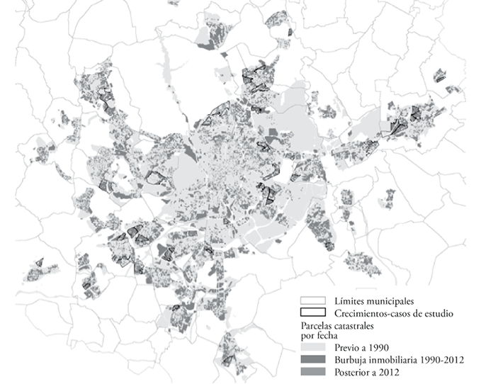 La burbuja inmobiliaria española ha sido un fenómeno sin precedentes en la historia de la urbanización del país. En apenas algo más de dos décadas –1990-2012, aproximadamente– se han desarrollado grandes crecimientos urbanos a lo largo y ancho del territorio, sin posibilidad de maduración prolongada en el tiempo y con una probable tendencia a la estandarización o simplificación de los patrones y tipologías de urbanización. Todo ello hace que la producción de una identidad social urbana, así como el grado de apropiación, se vean cuestionados en suelos urbanos que son no solo recientes, sino el producto de procesos acelerados y simplificados que han dado como resultado paisajes urbanos homogéneos, en ocasiones calificados como “ciudad genérica” o “ciudad-basura” y “sin historia, sin referentes, sin símbolos, sin nodos de urbanidad reconocibles” (López de Lucio, 2006, p. 87) y vinculados a la idea de “no-lugares” sin identidad propia de Augé (1994).