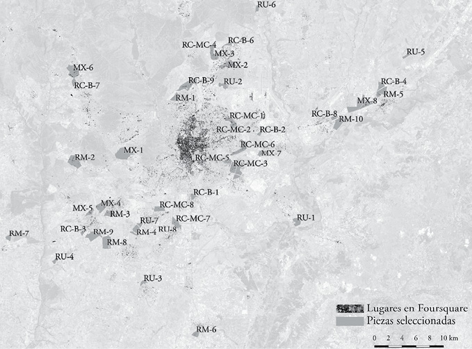 La base de datos de Foursquare descargada para este trabajo ha abarcado la Comunidad de Madrid y la compone un total de 94.010 lugares, donde se han registrado 16.553.533 check-ins. La descarga de datos se realizó en octubre de 2018, siendo los datos cuantitativos –número de check-ins, número de usuarios– de carácter acumulativo desde el registro de cada lugar en la red social, fecha potencialmente coincidente con, i) la implementación de Foursquare en 2009 o, ii) la fecha aproximada de apertura al público del lugar en cuestión. Las 43 piezas urbanas seleccionadas como casos de estudio incluyen en su contorno 4264 lugares registrados y, como se puede observar en la figura 2, no se sitúan en los entornos con mayor concentración de lugares en la base de Foursquare. Esta observación responde tanto a su carácter periférico o suburbano, como a su reciente desarrollo. Estas 43 piezas recogen apenas el 4,5% de lugares y de check-ins del conjunto de la Comunidad de Madrid.