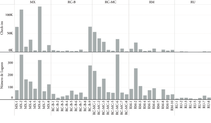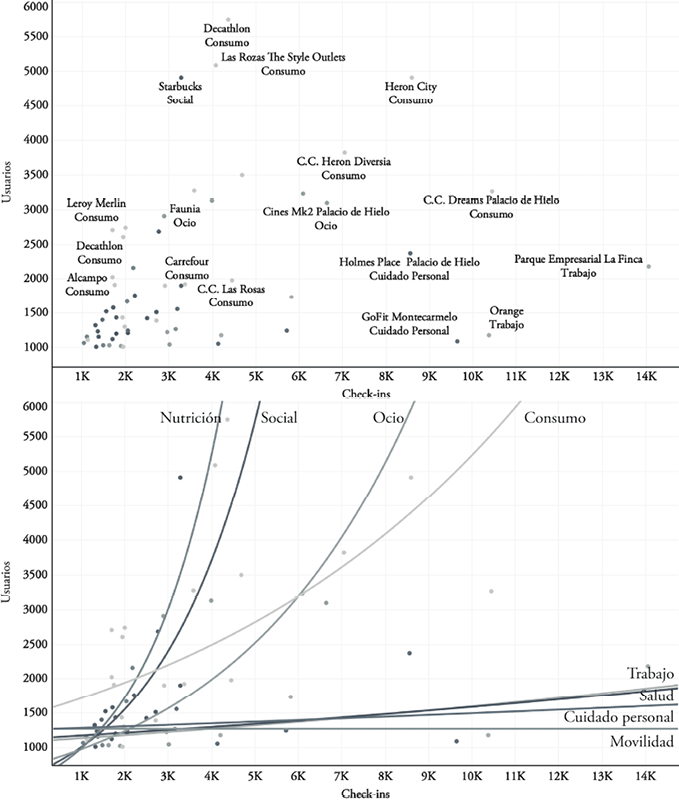 A partir de la distribución de los puntos en los gráficos de la figura 4, y tomando en cuenta ambos valores –número de check-ins y número de usuarios–, los lugares del set de datos quedan distribuidos gradualmente. En referencia a aquellos lugares con mayor número general tanto de usuarios que los han visitado como de visitas (check-ins) registradas en total, se observa que, salvo tres excepciones,1 se trata de grandes superficies comerciales, de ocio o equipamientos de relevancia a escala urbana. Por el contrario, aquellos más cercanos a los ejes representan lugares con relevancia únicamente en la escala local, como pequeñas tiendas, restaurantes, bares, etcétera.