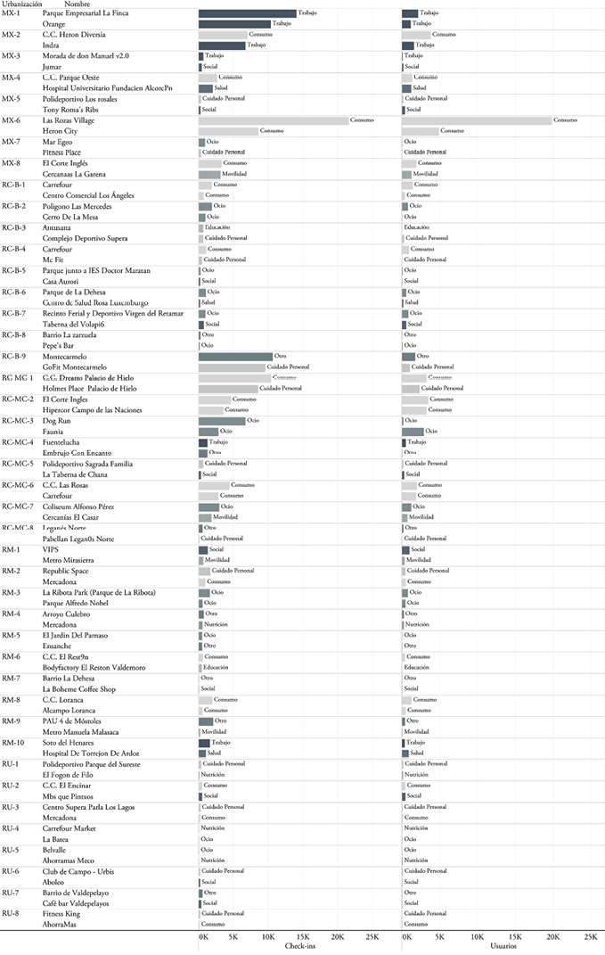 De manera general, aquellas piezas con un mayor número de lugares registrados tienden a tener un mayor número de check-ins acumulados, con dos excepciones. En primer lugar, el Ensanche Este de San Blas-Las Rosas (rcmc6) presenta un escaso número de check-ins en comparación con el gran número de lugares registrados. El ejemplo opuesto es Somosaguas Sur (mx1), con escaso número de lugares pero gran cantidad de check-ins, apuntando al alto valor simbólico o prestigio que ellos tendrían. Se trata de una zona distinguida, que incluye la urbanización La Finca, reconocida por su lujo y domicilios de celebridades. Por eso, no sorprende que todo usuario de Foursquare que pase por allí decida compartir su visita a su red social.