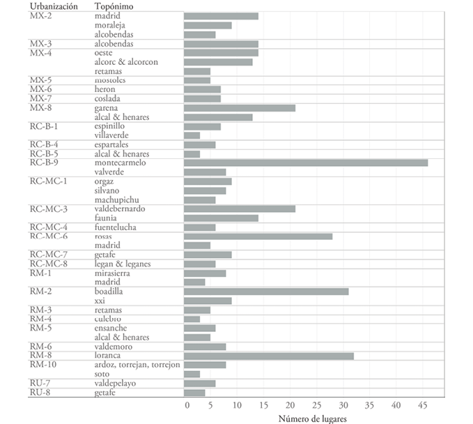 Finalmente, entre los resultados aparecen habitualmente los topónimos correspondientes al municipio donde se localiza la nueva pieza (Getafe, Alcalá de Henares o Alcobendas, entre otros, recogidos en la figura 6). Esto podría apuntar a cómo, por medio del nombre de los equipamientos, comercios y empresas, se está insistiendo en el vínculo y la pertenencia del nuevo desarrollo a la ciudad existente. Entre todos los casos, destaca el éxito del topónimo Boadilla en la pieza del Ensanche de Boadilla (rm-2), siendo un desarrollo que supera ampliamente en extensión al casco urbano preexistente.