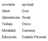 Cerrone et al. (2018) proponen una clasificación basada en dos categorías (“Necesaria” y “Opcional”) y diez subcategorías, cinco en cada uno de esos dos grupos, recogidas en la tabla 2. A estas diez subcategorías se añade otra sin definir (“Otro”), la cual engloba aquellos lugares sin una actividad primaria definida, como barrios, calles o edificios entendidos como “un lugar” en su conjunto. Estos lugares existen en la base de datos, también registran visitas por los usuarios y son accesibles a la búsqueda por nombre, por lo que a pesar de no describir una actividad concreta, su utilidad en el estudio de hitos y toponimia no queda en absoluto descartada.