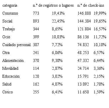 Los datos de Foursquare han sido ya empleados con diferentes objetivos dentro de la disciplina urbanística, desde el análisis de la diversidad de actividad económica en la ciudad (Agryzkov et al., 2015) hasta la preferencia por diferentes espacios (Martí, Serrano-Estrada, & Nolasco-Cirugeda, 2017) o su popularidad (Komninos, Stefanis, Plessas, & Besharat, 2013; Serrano-Estrada, Salvador, & Álvarez Álvarez, 2014). Cerrone, López Baeza y Lehtovuori (2018) han utilizado Foursquare como base para una clasificación de actividades sobre la que también han desarrollado un índice de complejidad económica, entropía de actividades y tipos de actividad por tramo de calle (López Baeza, Cerrone, & Männigo, 2017).