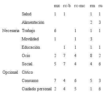Entrando a valorar a partir de los tipos de actividad, un primer hecho necesario de comentar es el mucho mayor número de hitos asociados a actividades opcionales, respecto a las necesarias. Esto entra en la lógica de la excepcionalidad y de la construcción de la identidad personal a partir de la elección voluntaria de actividades y de lugares, en relación al spatial self presentado en la literatura revisada.