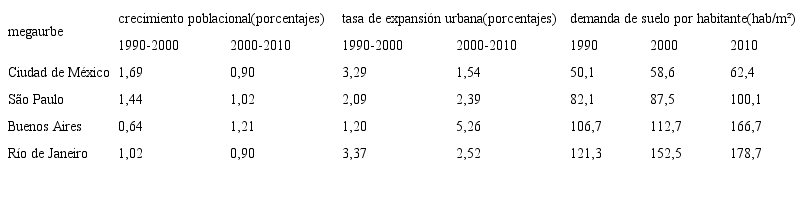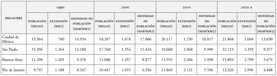 No obstante, es claro que en las cuatro megaciudades se presenta un proceso de uso extensivo del suelo con una reducción sostenida de la densidad de población. A partir de esta tendencia es que se prevé que, para 2020, la densidad de las cuatro áreas metropolitana será prácticamente la mitad de la registrada en 1990. Ello significa que la velocidad de expansión urbana es claramente mayor que el incremento poblacional, tal y como se puede ver en el tabla 2.