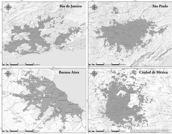 Para realizar el análisis se consideraron fuentes estadísticas y geográficas. Las fuentes estadísticas utilizadas son los Censos Demográficos de 2000 y 2010 del Instituto Brasileiro de Geografía e Estadística (ibge) para el caso de Río de Janeiro y São Paulo; los Censos Nacionales de Población, Hogares y Vivienda de 2001 y 2010 del Instituto Nacional de Estadística y Censos (indec) para el caso de Buenos Aires; y los Censos de Población y Vivienda 2000 y 2010 del Instituto Nacional de Geografía y Estadística (inegi) para la Ciudad de México.