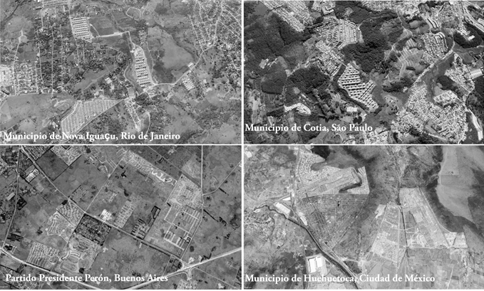 En la figura 2 se puede observar casos particulares de cada una de las periferias metropolitanas de las cuatro urbes en cuestión. En los cuatro casos se identifican patrones de “saltos de rana” que generan conjuntos habitacionales construidos por el sector inmobiliario. Para el caso de las ciudades brasileñas, Río de Janeiro tiene una expansión urbana que alcanza el municipio de Nova Iguaçu, donde se observan varias unidades habitacionales, como “Residencial Nice”, cuyo diseño y traza de calles no se integran a la existente y se localizan en los intersticios de los poblados. Respecto de São Paulo, el conjunto habitacional Valle Verde, localizado en el municipio conurbado de Cotia, se desintegra de la urbanización aledaña mediante una franja de área verde que formalmente no es un espacio público aprovechable por los habitantes del conjunto habitacional ni por los pobladores. Caso particular se identifica en la Ciudad de Buenos Aires, pues en el partido de Presidente Perón se localizan diversos conjuntos habitacionales terminados y otros en proceso de construcción, ubicados en un área completamente aislada de la zona urbana. Nuevamente se identifican fraccionamientos cerrados, sin la posibilidad futura de integrarse a un entramado vial, y ubicados en un emplazamiento que motiva la fragmentación espacial. Mismo fenómeno ocurre en el municipio de Huehuetoca, periferia norte de la Ciudad de México, donde masivos conjuntos habitacionales, como Paseos de la Pradera, se encuentran en una zona completamente aislada de la zona urbana. En todos los casos, es clara la ausencia de una conectividad adecuada con el resto de la urbe.