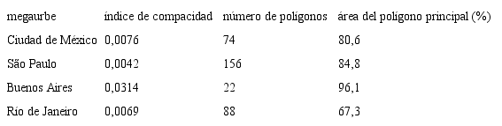 Con el inicio de la segunda década de este milenio, la reterritorialización que implican los procesos señalados se manifiesta ya claramente en la morfología de las áreas metropolitanas de las cuatro megaciudades (figura 1). En los cuatro casos se puede identificar un polígono principal de mayor magnitud y población, circundado por una serie de micropolígonos que representan las áreas urbanizadas y próximas a conurbarse, sin una continuidad urbana con el polígono principal. Esta morfología se expresa en los índices de compacidad, que ayudan a cuantificar el grado de fragmentación geométrica de las áreas metropolitanas (tabla 3).
