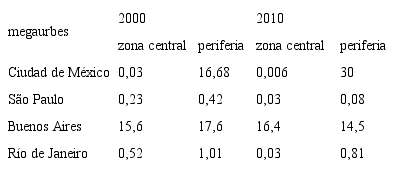 elaboración propia a partir de los datos recabados de angel, parent, civco y blei (2011), gilbert (1995), ibge (2000; 2010), indec (2003; 2010), inegi (1990; 2000; 2010), picorelli et al. (2009), y united nations (2014)Es claro que la tasa de crecimiento media anual (tcma) de la población urbana ha disminuido en términos porcentuales como consecuencia del decremento de los procesos migratorios de la población rural y de la reducción de la tasa de fecundidad. En contrapartida, la expansión de las ciudades es creciente. En el tabla 1 se puede observar el incremento de la extensión territorial de las megaurbes latinoamericanas, a tal grado que las densidades de población están en claro declive. Por un lado se tiene la Ciudad de México, que muestra durante el periodo de 1990 a 2010 la mayor densidad de población, en contraste de Río de Janeiro, la megaurbe menos poblada pero también la más dispersa. Ello evidencia que la magnitud de la urbe no deriva en una mayor dispersión, siendo otros factores, que se revisarán en la siguiente sección, los motivadores de dicho fenómeno.
