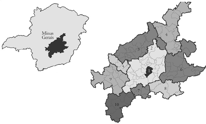 Nesse momento, optamos por selecionar a Região Metropolitana de Belo Horizonte e suas microrregiões circunvizinhas, que passaremos a chamar de Região Metropolitana de Belo Horizonte Expandida (rmbhexp – composta por 113 municípios). Selecionamos, assim, uma região metropolitana da grande região brasileira com os maiores valores de déficit: o Sudeste. Tendo em vista o propósito de averiguar a correlação entre empreendimentos habitacionais e movimentos migratórios, sobretudo em direção à periferia e ao interior, dividimos a rmbh em duas classes: bh e demais municípios da rmbh. Dessa maneira, reclassificamos a rmbhexp em 10 outras divisões territoriais, sendo: i) Belo Horizonte; ii) Demais municípios da rmbh; iii) Microrregião de Sete Lagoas; iv) Microrregião de Mato Dentro; v) Microrregião de Pará de Minas; vi) Microrregião de Itabira; vii) Microrregião de Itaguara; viii) Microrregião de Ouro Preto, ix) Microrregião de Divinópolis e x) Microrregião de Oliveira (Figura 1).