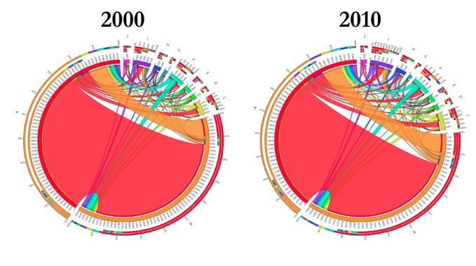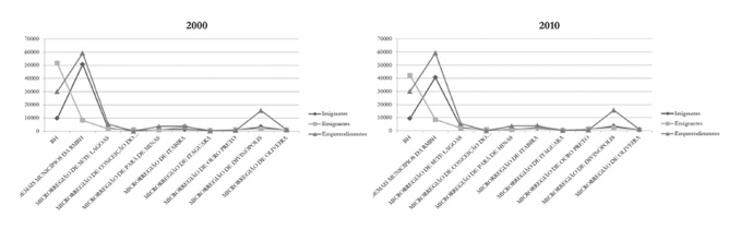 A Figura 2 nos traz os dados sintetizados em peças gráficas da matriz migratória da rmbhexp conforme os Censos 2000 e 2010, ou seja, de todos aqueles responsáveis por domicílios que, em 31 de julho de 1995 e de 2005, residiam num município da região diferente do município de residência atual.