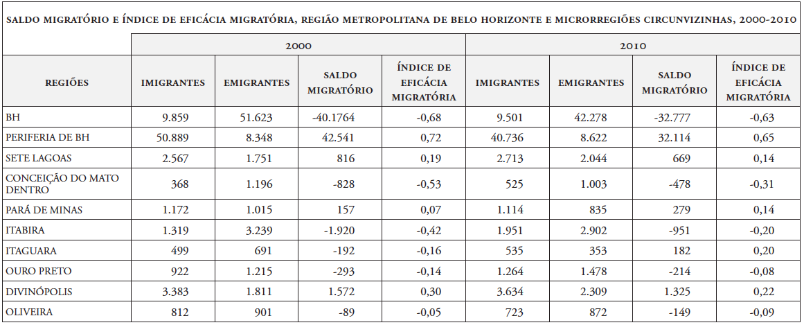 O que, de fato, ocorreu foi uma diminuição dos valores absolutos dos fluxos migratórios, em que a periferia da rmbh é o principal destino dos imigrantes (especialmente aqueles de bh) e bh é a principal área de origem dos fluxos emigratórios. É interessante observar que a segunda mais importante região de emigração é a própria periferia da rmbh (embora em patamares muito inferiores aos valores de bh). Boa parte desse contingente se destina a bh (aproximadamente 69% do total de fluxos emigratórios da periferia da rmbh), numa relação de simbiose entre sede e municípios periféricos limítrofes. No entanto, ainda que com cifras muito inferiores aos patamares de emigrantes destinados à sede, são dignos de atenção os fluxos migratórios com destino às microrregiões de Sete Lagoas e Divinópolis. Em suma, tratam-se dos mesmos vetores de crescimento já apontados anteriormente.