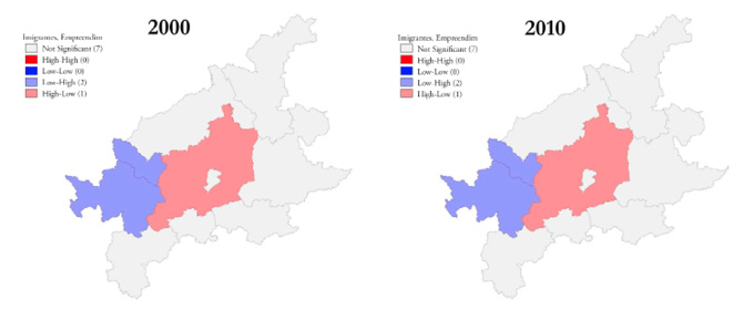 Por fim, adotamos uma série de instrumentos eminentemente demográficos com o objetivo de analisar a possível associação entre política habitacional e migração: i) matrizes migratórias 2000 e 2010, ii) índice de eficácia migratória, iii) saldo migratório, iv) índice de correlação de Pearson e, por último, e) índice de Moran Global. Ou seja, partimos da premissa de que há uma correlação linear, diretamente proporcional e positiva entre o estabelecimento de novas residências e o aumento de fluxos migratórios ou, ao contrário, subvertendo a causalidade: os empreendimentos do pmcmv vindo a reboque de fluxos migratórios passados. Por esta razão, optamos por nos valermos do índice de correlação do Pearson. Não menos importante, afora a correlação entre habitação e migração, inferimos que haja igualmente correspondência espacial entre os fenômenos. Dessa maneira, o índice de Moran Global averigua a autocorrelação – ou dependência – espacial das variáveis a partir do produto dos desvios em relação à média. A hipótese nula, neste caso, significa independência espacial entre as variáveis, sendo que valores positivos representam correlações diretas e, negativos, inversas (Neves, Ramos, Camargo, Câmara, & Monteiro, 2000).