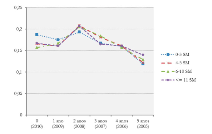 Desde 2005, a tendência era de intensificação da migração intra-rmbhexp, pelo menos até 2008. Por sua vez, o ano de 2008 é de inflexão nos rumos da migração regional. Não há surtos migratórios após o lançamento do pmcmv, como seria de se supor, embora, a partir de 2009, possamos constatar a retomada da migração intra-rmbhexp, sobretudo entre migrantes financeiramente mais carentes. Todavia, essa retomada não se dá com a mesma intensidade dos anos anteriores; basta nos atentarmos para a inclinação da reta.