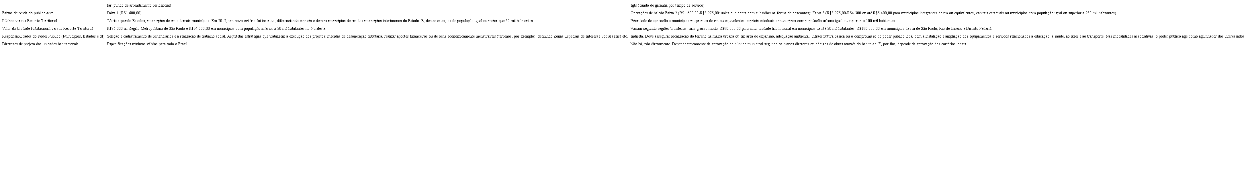 Na Tabela 1, apresentamos resumidamente algumas características do programa segundo a fonte do recurso financeiro em questão e, especialmente, aclarando que as faixas de renda e os subsídios apresentavam singularidades territoriais.