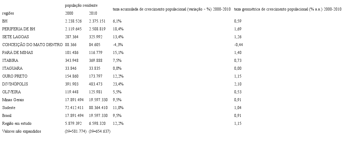 Em suma, em harmonia com os dados da Tabela 2, a região que cresce mais lentamente é novamente a sede metropolitana, enquanto a população de Divinópolis, da periferia da rmbh e de Sete Lagoas aumenta velozmente. Logo, os dados apontam para um processo de distribuição espacial da população em direção à periferia e alguns vetores específicos. Trata-se de um processo combinado de desconcentração da população da sede metropolitana e sua concentração na periferia ou microrregiões dos arredores da rmbh. Aliada a este contrabalancear populacional, encontra-se a própria tendência de crescimento da urbanização e dos estoques habitacionais em determinadas regiões.