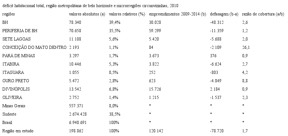 Por outro lado, algo distinto se passa em Divinópolis e em Pará de Minas. Essas são as duas únicas microrregiões em que o pmcmv produziu excedentes habitacionais. Não podemos dizer o mesmo para a Periferia da rmbh ou para a microrregião de Sete Lagoas, entretanto a razão de cobertura ali mostrou ser a mais relativamente próxima a 1 em comparação aos demais recortes territoriais.