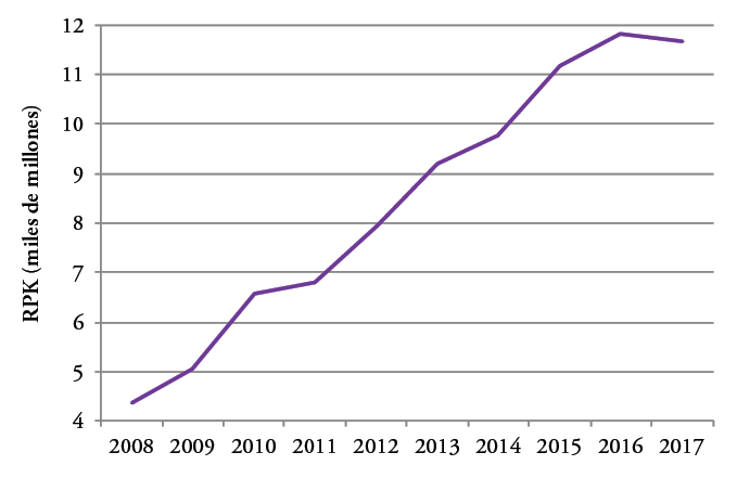En Colombia, el incremento del tráfico aéreo en conjunto (todos los aeropuertos) y total (sumando pasajeros nacionales e internacionales), fue del 863% en el periodo 1992-2016 (Aerocivil, 2018a). Ahora bien, aunque esta cifra dice mucho sobre el aumento de pasajeros transportados, en transporte aéreo se utiliza, más frecuentemente, el indicador denominado “pasajeros-kilómetro transportados”, o más usado en su acrónimo en inglés, rpk (Revenue Passenger Kilometers), que suministra una medida más exacta del tráfico real, ya que considera la distancia que el pasajero recorre en su viaje. Este indicador ayuda a identificar y dimensionar la cobertura geográfica de un aeropuerto (en distancia hacia sus diferentes destinos). Entonces, en el caso de Colombia, el rpk del sistema aeroportuario ha experimentado un relevante y mantenido crecimiento en la última década, resultado de la entrada de nuevos operadores al mercado (en especial los lcc) y de la incorporación, por parte de las líneas aéreas, tanto de nuevos destinos como de un mayor número de frecuencias a todos los destinos (Díaz Olariaga, 2016a).