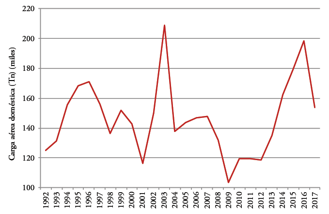 La figura 1 muestra la evolución del rpk nacional (o doméstico) del conjunto de aeropuertos de Colombia. El incremento del rpk nacional (que prácticamente se triplicó en la última década) se debe exclusivamente al aumento de la oferta de asientos y frecuencias por parte de los operadores aéreos, ya que la red de destinos (red de aeropuertos) se ha mantenido inalterable en las últimas décadas. Este continuo aumento de la oferta de servicio de transporte aéreo, como respuesta a una creciente demanda, fue posible gracias a la mayor capacidad en infraestructura (y modernización tecnológica) de la red colombiana de aeropuertos, producto a su vez del desarrollo de políticas públicas de inversión (pública y privada) en dicha red, implementadas a lo largo de las últimas dos décadas, como se mencionó con anterioridad. En lo que se refiere al transporte de la carga aérea doméstica, en la figura 2 se muestra su evolución (a nivel Colombia) para los últimos 26 años. Como se aprecia, es un mercado que aún no termina de madurar (Díaz Olariaga & Ávila, 2015).