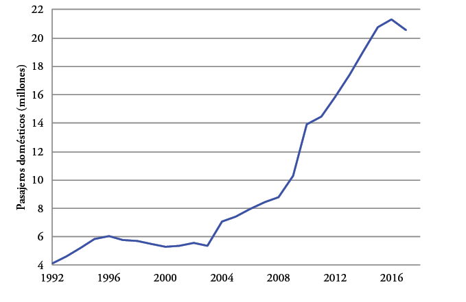 En otro orden, es necesario mencionar que el verdadero motor del crecimiento del tráfico aéreo a nivel nacional fue el Aeropuerto Internacional de Bogotá-El Dorado (bog), en la capital del país, el cual es el principal aeropuerto distribuidor (hub) de la red. bog conecta con todos los destinos a nivel nacional, es decir, tiene rutas con vuelos programados (o regulares) a todos los aeropuertos del país abiertos al tráfico comercial (Aerocivil, 2018a), lo que implica una cobertura del 100% en lo que refiere a conectividad aérea a nivel territorial. La figura 3 muestra la evolución de la demanda de pasajes aéreos nacionales (o domésticos) de bog desde el año 1992 (año siguiente a la liberalización del transporte aéreo en Colombia), y de la misma se puede destacar: i) el crecimiento relevante de la demanda iniciado en el año 2006, cuando se privatizó bog (en cuya ampliación y modernización se invirtieron 650 millones de dólares), potenciado luego por las siguientes generaciones de concesiones aeroportuarias (2008, 2010 y 2015); y una segunda gran ampliación de bog (entre 2015 y 2018); y ii) la caída de la demanda en el año 2017, debido a la huelga de pilotos de la principal aerolínea del país (Avianca) y que duró 51 días (donde la caída de reservas fue de entre el 20 y el 30%).