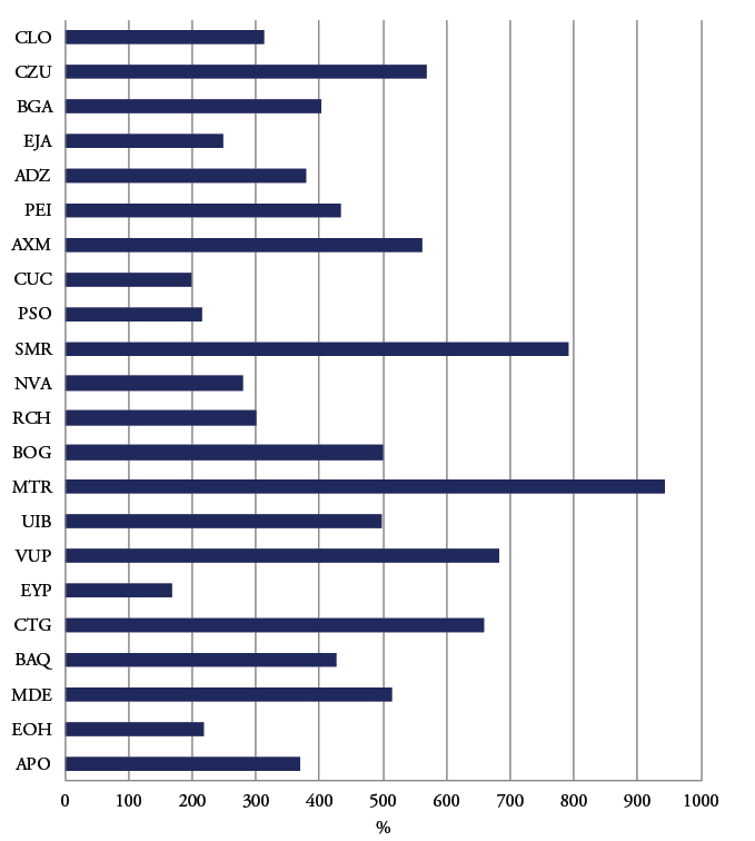 En la figura 4 se representa el crecimiento porcentual del tráfico de pasajeros domésticos de los aeropuertos más importantes del país en el periodo 1992-2017. Es necesario destacar que el relevante crecimiento del tráfico aéreo no se verifica solo en el principal aeropuerto del país (y hub), Bogotá-bog (en el centro geográfico del país), sino que iguales o aún mayores crecimientos de transporte de pasajeros domésticos experimentan las ciudades periféricas de las regiones de la costa Caribe (czu, smr, vup, ctg, baq), de la costa Pacífico (uib), insular (adz), y de la Andina Central (pei, axm, apo, mde).