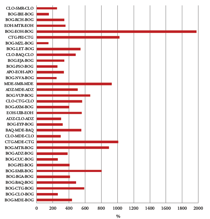 El indicador mostrado en la figura 5 es el mejor reflejo de la creciente dinámica de la conectividad territorial vía aérea en Colombia, la cual se verifica no solo entre la capital del país (a través de su aeropuerto distribuidor, bog) y las diferentes regiones, sino que viene aumentando entre las regiones mismas (sin necesidad de conectarse vía la capital del país). Es necesario destacar que los mayores incrementos de tráfico aéreo interregional se verifican entre: i) la capital del país y la región Andina Central (bog-eoh); ii) la capital del país y la costa Caribe (bog-smr, bog-ctg, bog-mtr, bog-vup); iii) la región Andina Central y la costa Caribe (ctg-pei, mde-smr, ctg-mde); y iv) la capital del país y la región Amazónica (bog-let).