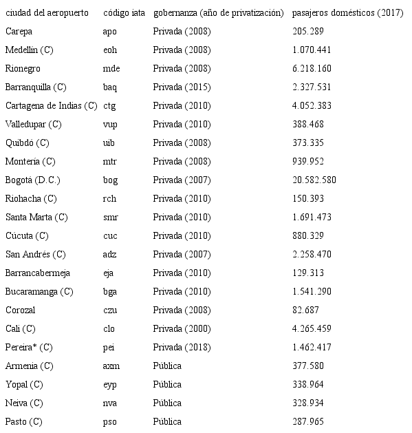 En la tabla 1 se muestran los datos generales de los aeropuertos más importantes del país (y que concentran el grueso del tráfico de la red doméstica colombiana).
