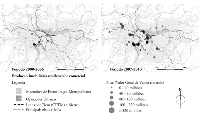 Ao concentrarmos o olhar sobre os lançamentos imobiliários entre 2007 e 2013, evidencia-se a exploração de novas fronteiras imobiliárias, extrapolando uma histórica tendência de concentração de investimentos imobiliários no vetor sudoeste – o mais valorizado da metrópole. As novas fronteiras imobiliárias marcam tanto o alcance de territórios pouco infraestruturados como a reapropriação de áreas industriais no curso de processos de reestruturação.